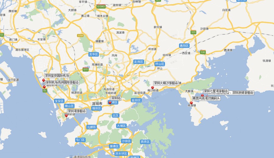 深圳機(jī)場(chǎng)鴻洲國(guó)際游艇會(huì):42公里,預(yù)計(jì)50分鐘